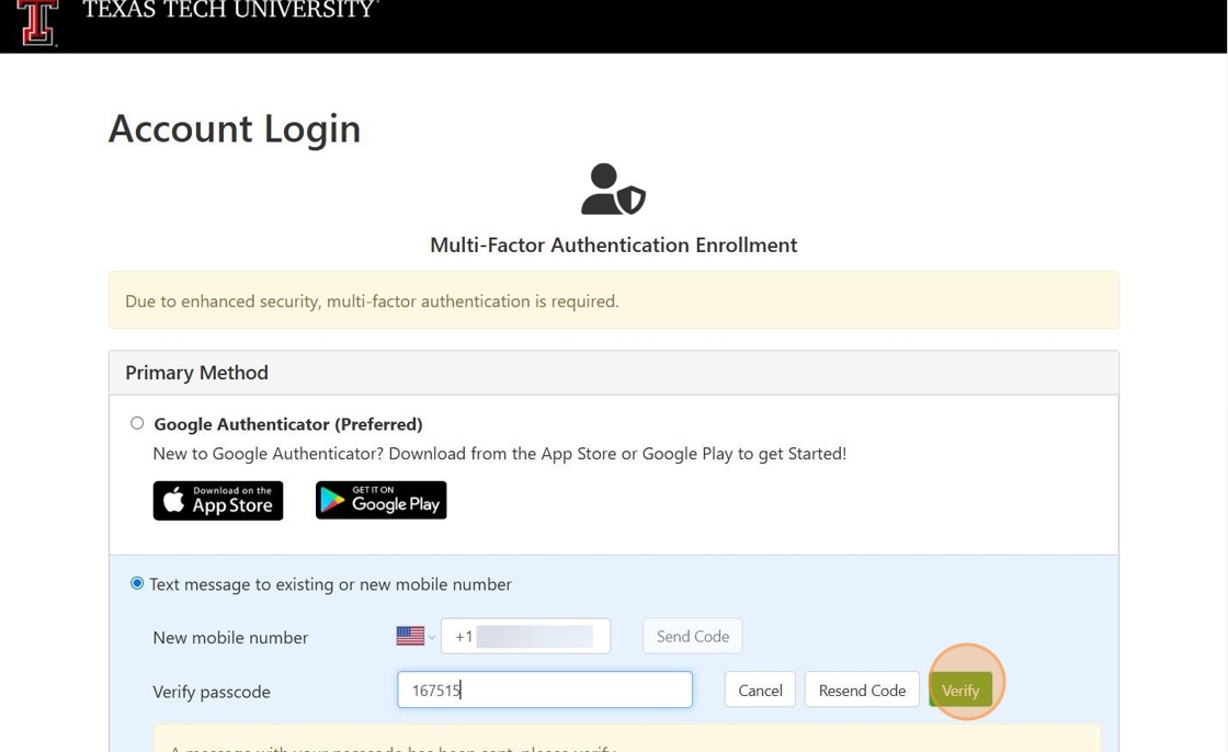 6. Enter in code received and select "Verify".