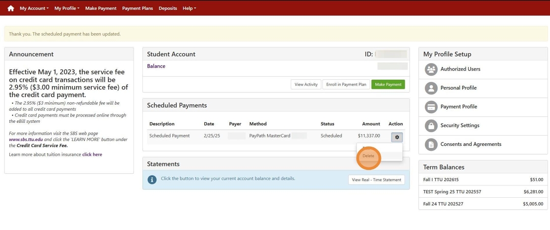 15. A pop-up box will appear for you to confirm your request to delete your scheduled payment