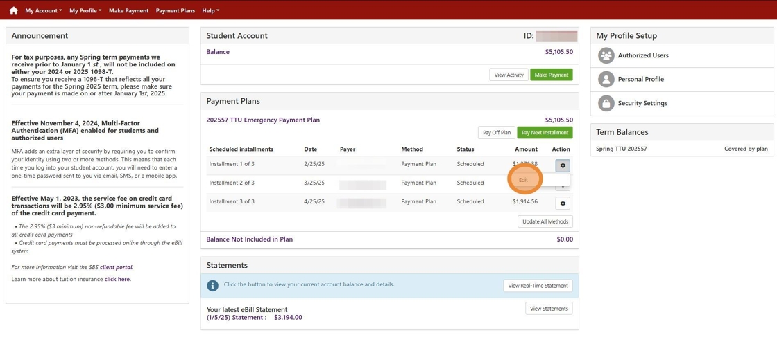 6. Under "Action" Select the gear icon next to the installment that you want to edit